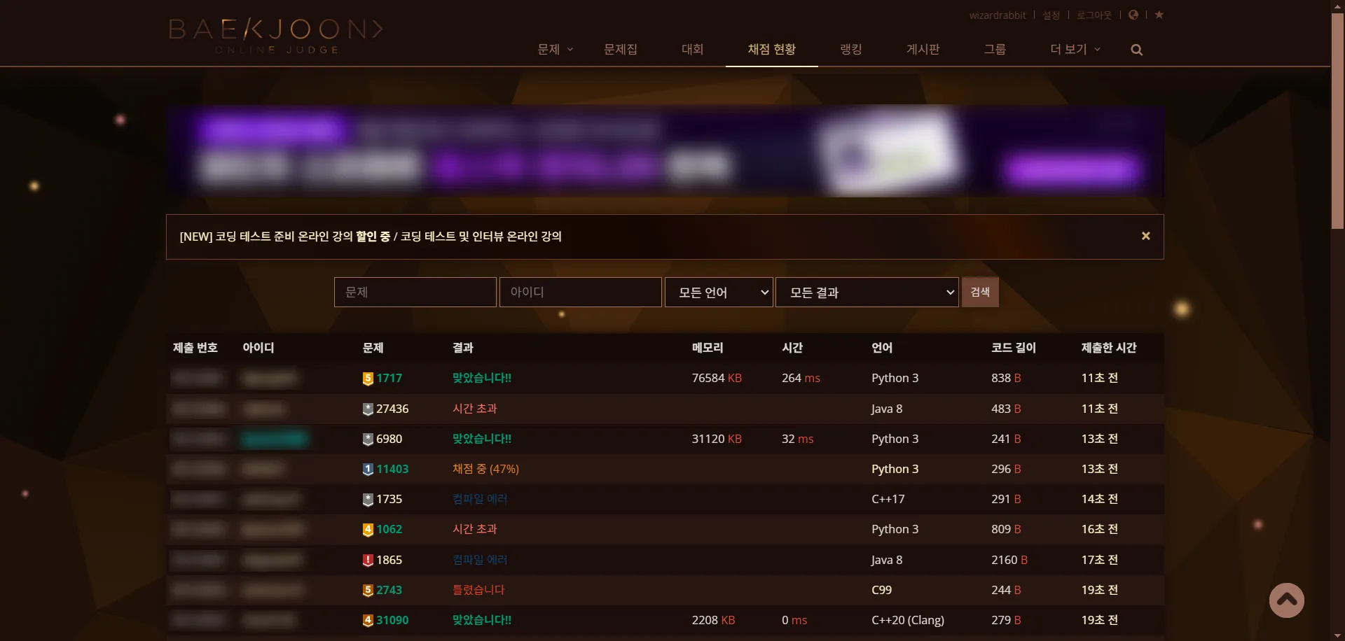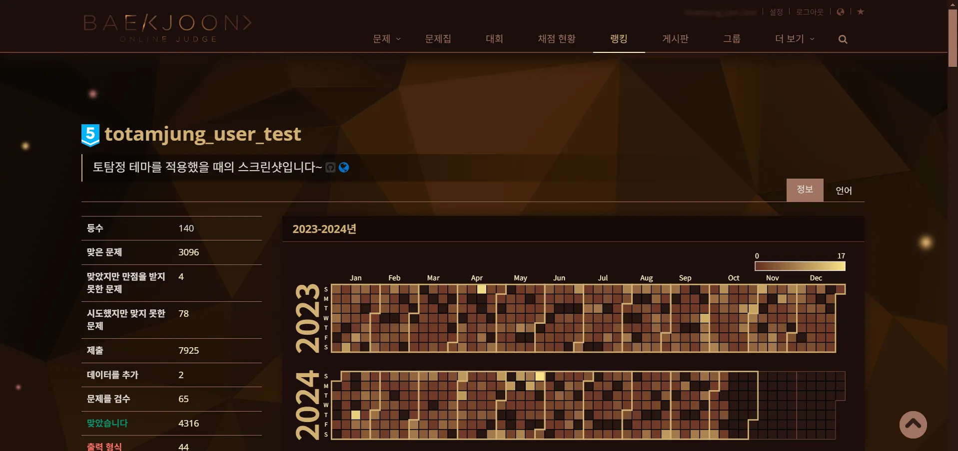 섹션 제목: “BOJ Extended와 같이 사용하는 경우”토탐정은 BOJ Extended 확장 프로그램의 테마에 대한 대비가 되어 있으며, 토탐정 위젯의 디자인 또한 BOJ Extended의 테마에 맞게 변경됩니다.