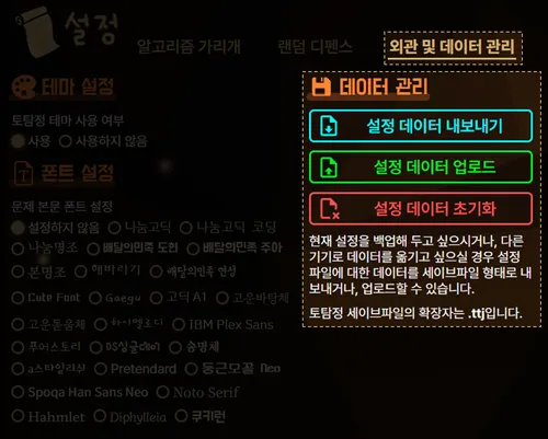 - 설정 데이터 내보내기: 현재 데이터를 세이브파일의 형태로 내보냅니다. 토탐정 세이브파일의 확장자는