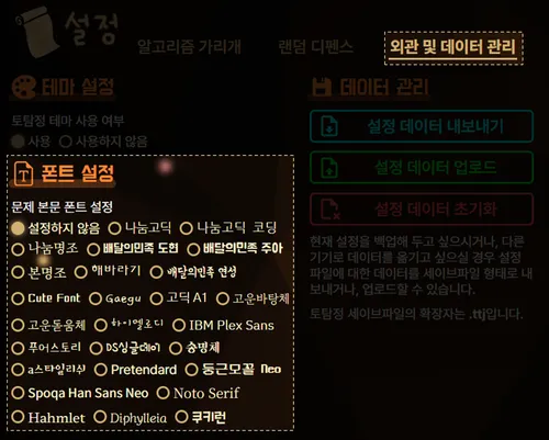 섹션 제목: “문제 본문 폰트 설정”문제 본문의 폰트를 취향에 맞게 고르실 수 있습니다. 토탐정에서는 20여종의 폰트를 제공합니다. 문제 본문 폰트는 설정 페이지의 외관 및 데이터 관리 카테고리에 있는 폰트 설정 메뉴에서 설정하실 수 있습니다.
