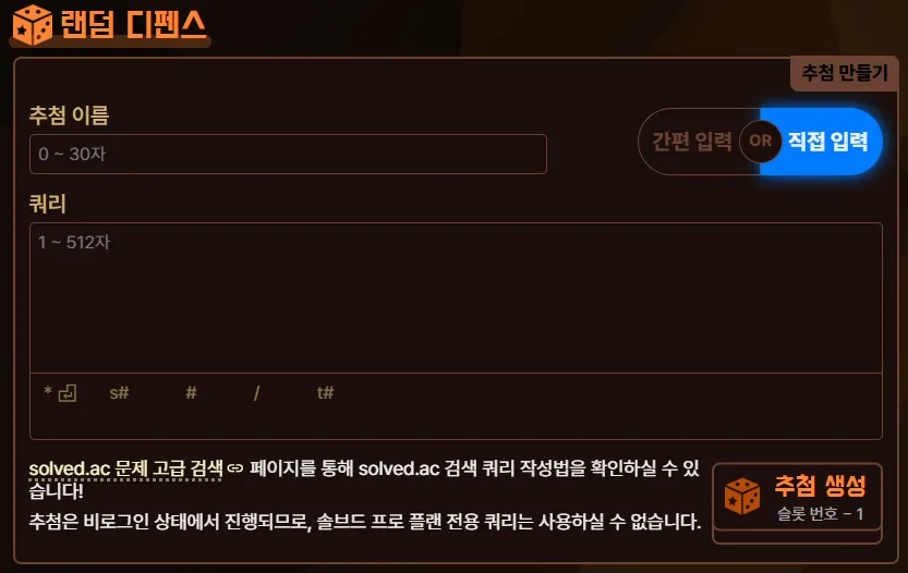- 쿼리: 이곳에 솔브드의 검색 쿼리를 직접 입력하실 수 있습니다. 추첨을 생성할 때 이 쿼리가 그대로 반영됩니다.