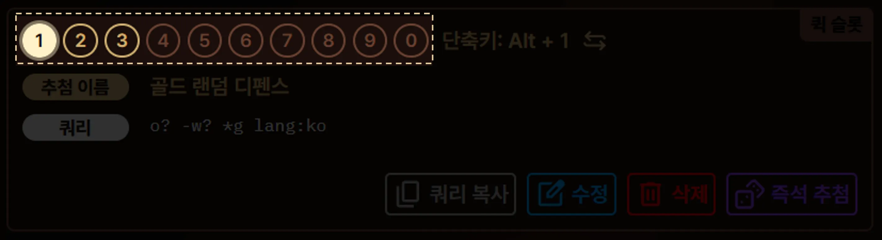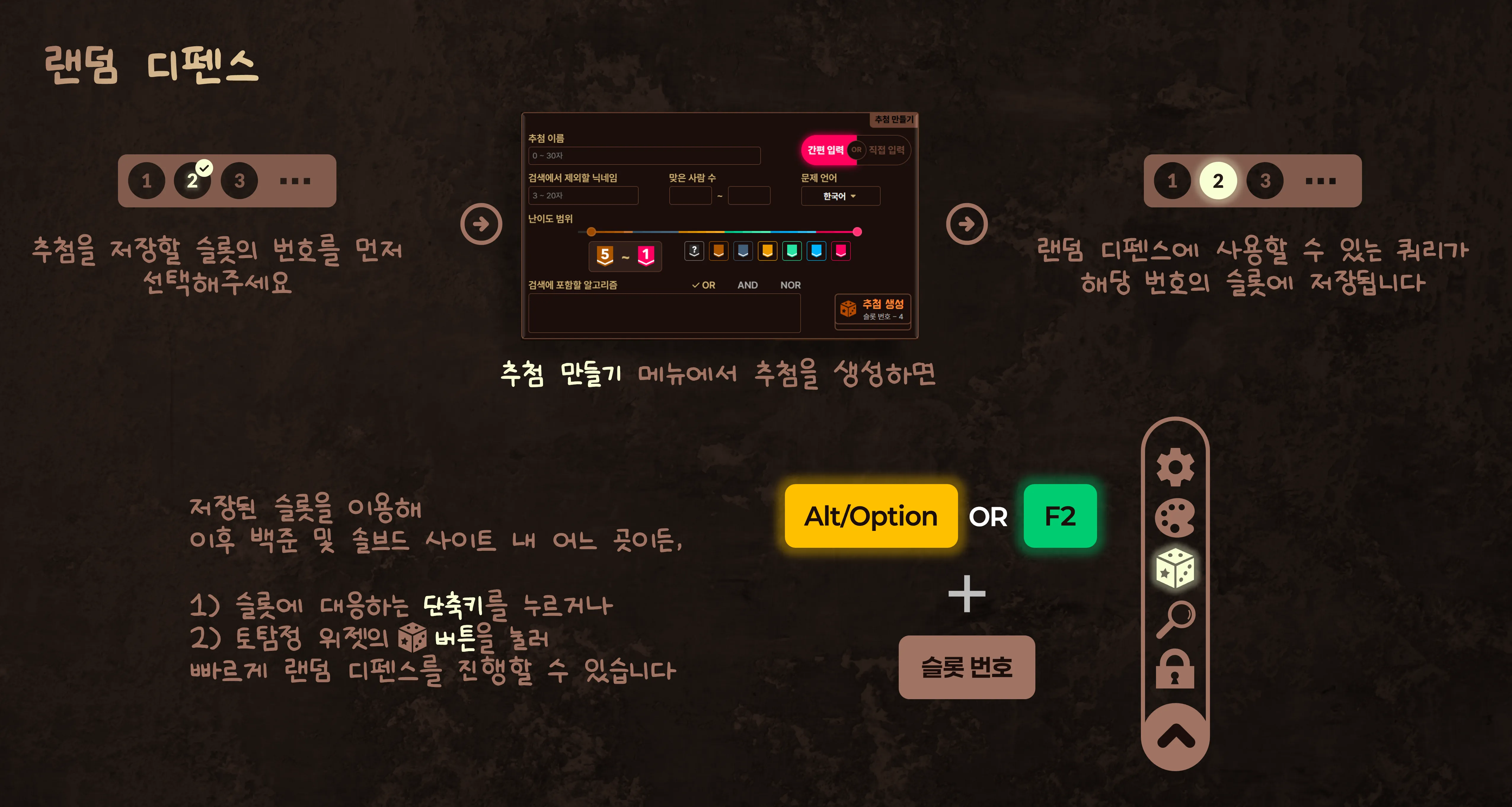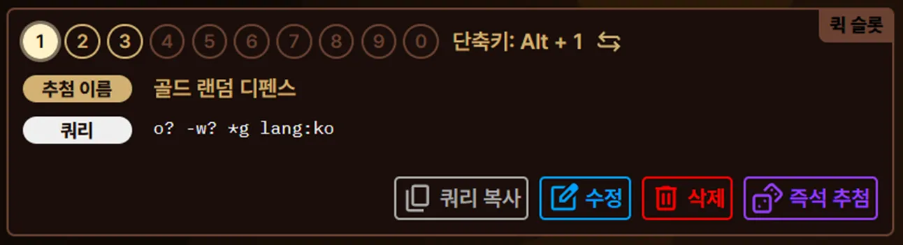 - 자주 사용하는 솔브드의 검색 쿼리를 저장할 수 있는 슬롯을 최대 10개까지 사용할 수 있으며, 슬롯 번호에 대응하는 숫자와 조합한 단축키를 사용해 원하는 쿼리로 랜덤 디펜스를 자유자재로 시작할 수 있습니다.