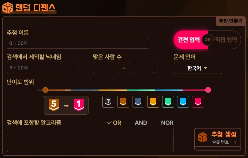 - AND: 지정된 알고리즘 분류들을 모두 포함하는 문제들만을 추첨합니다.