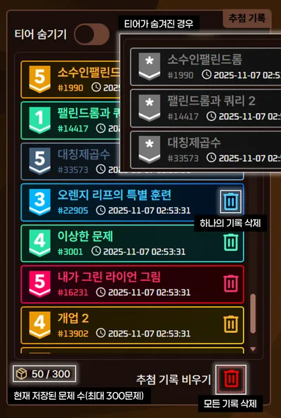 섹션 제목: “추첨 기록을 관리하는 방법”우측에 있는 추첨 기록 메뉴에서 추첨된 문제들의 기록을 확인하고 관리하실 수 있습니다. 랜덤 디펜스가 진행되어 추첨이 진행되면 자동으로 추첨 기록에 문제가 저장됩니다.