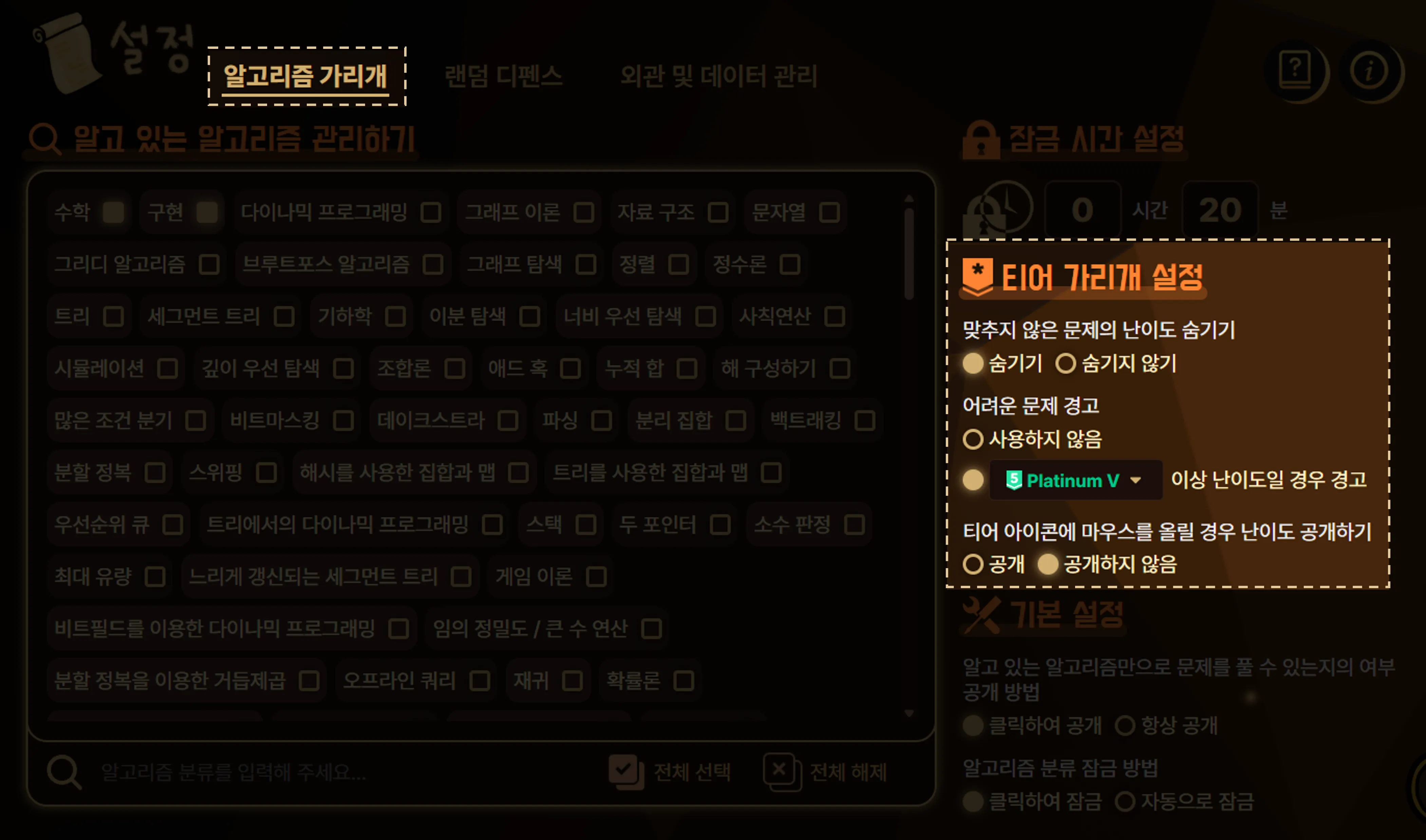 섹션 제목: “설정 방법”티어 가리개는 설정 페이지의 [알고리즘 가리개] - [티어 가리개 설정] 메뉴에서 설정하실 수 있습니다.